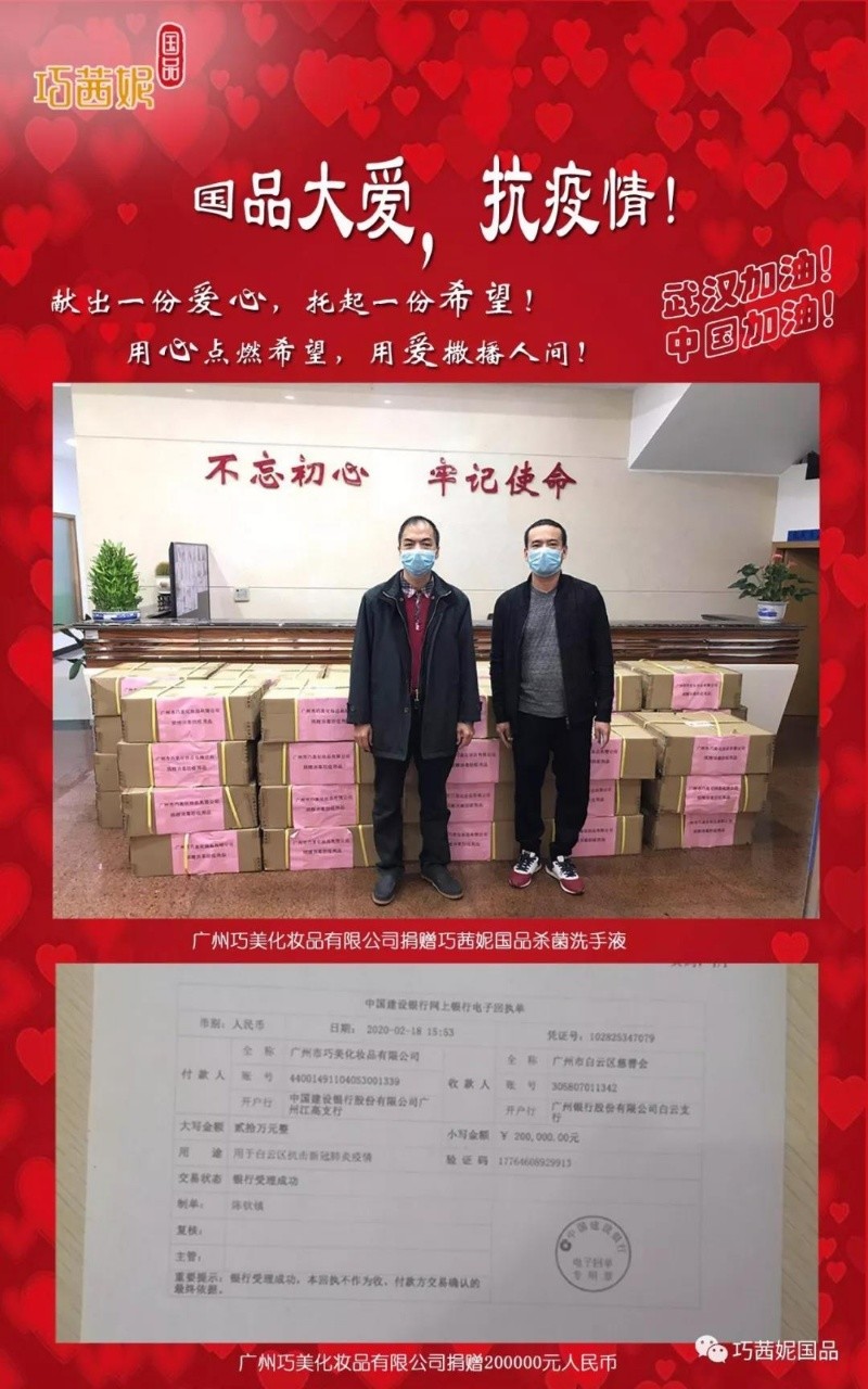 獻出一份愛心,托起一份希望!用心點燃希望,用愛撒播人間!面對當前新冠肺炎疫情,廣州巧美化妝品有限公司2020年2月18日捐贈了20萬元人民幣,同時還捐贈了防護消毒物資(巧茜妮國品殺菌洗手液),希望能為這個社會貢獻一份力量!