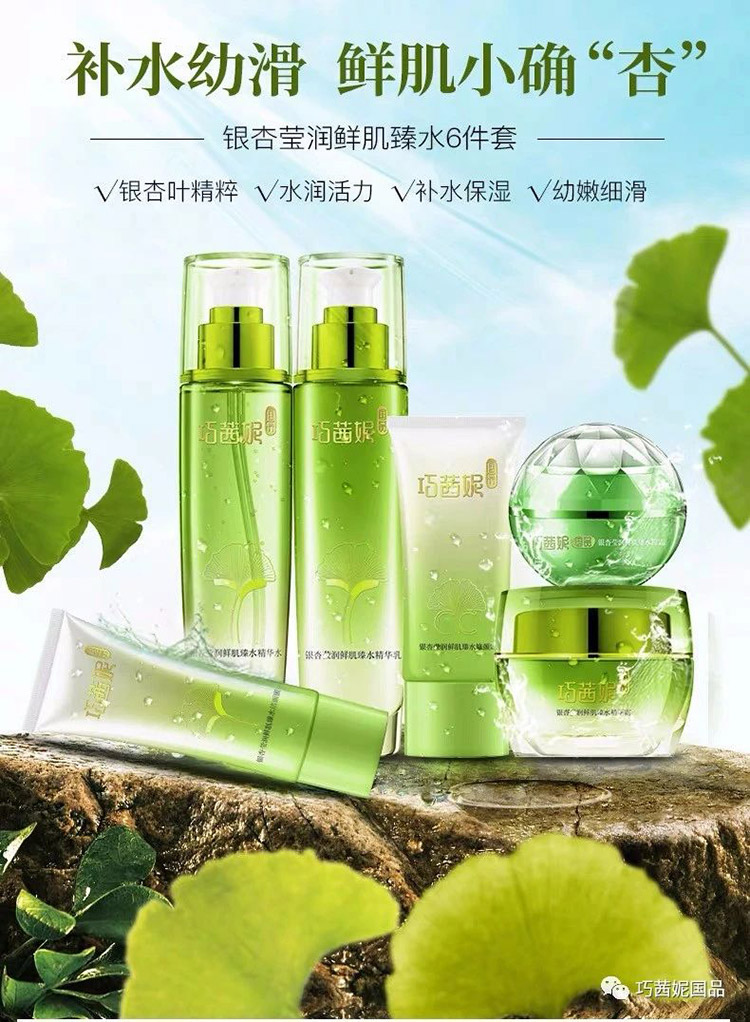 國樹銀杏,被稱之為是中華珍木,億年名品,我們全國最大的銀杏培育基地是在山東省郯城縣,巧茜妮國品以銀杏葉為設計理念,融入中國風的藝術化,展現獨一無二中國之美。 銀杏的全身都是寶,銀杏葉、銀杏果提煉到我們的美容護膚品當中除了具有抗氧化、抗輻射的功效,另還具有神奇的補水功效。
