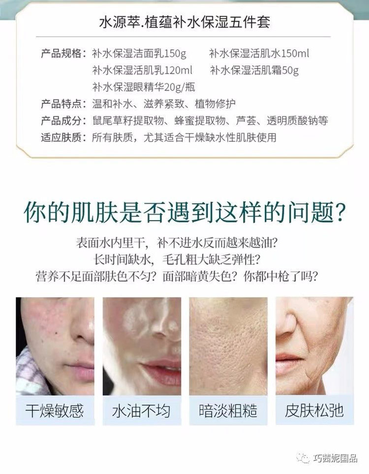 巧茜妮國品植蘊補水保濕系列產品,內含天然鼠尾草籽成份,為肌膚提供水源動力,持續補充水分和營養,令肌膚水嫩保濕緊致有彈力。
