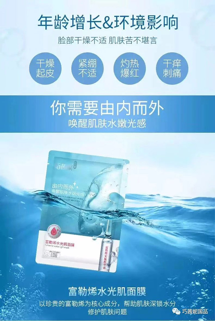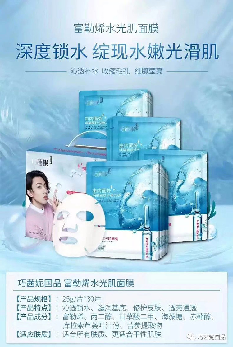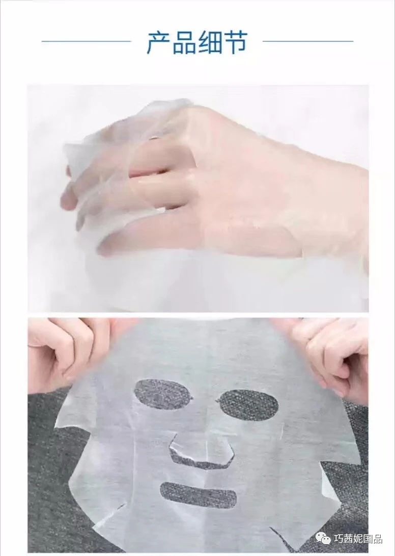 巧茜妮國品富勒烯水光肌面膜,面膜包裝是比較小清新的風格,膜紙輕盈柔軟親膚服帖。含有富勒烯和海藻糖等溫和成份,讓肌膚水潤有光澤并舒緩鎮定肌膚。