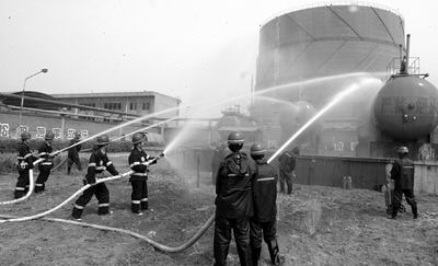 在指揮部的統(tǒng)一指揮下,警戒組、技術(shù)組、滅火組、鋼瓶轉(zhuǎn)移組高速運轉(zhuǎn)起來,水帶連接、滅火器到位……一切都在緊張有序地進行著,兩條銀色的“水蛇”也急不可待地向罐體的泄漏處飛射而去。
