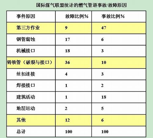 數(shù)據(jù)顯示,雖然第三方作業(yè)造成燃氣管道故障的比例只有9%,但是因其造成的事故總數(shù)卻占所有燃氣事故的47%。即使在燃氣事業(yè)發(fā)展相對成熟的歐美國家,第三方破壞事故的預防亦是有待解決的重要課題。如歐洲燃氣管道事故原因的統(tǒng)計比例中第三方損害占50%,美國的稍低、但也達到了39%。因此,隨著城市市政工程的不斷展開,第三方作業(yè)損害預防工作的開展應引起我們的高度重視,加強巡線管理應成為當務之急。