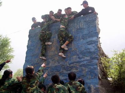 什么是“不到南墻不死心”,看看橫在面前高達(dá)四米多的障礙物以及上面掩映不住的笑臉就知道了。下有隊友甘做人梯,上有同伴傾力援手,9分50秒內(nèi),28名參訓(xùn)人員便順利完成了徒手攀越障礙環(huán)節(jié)的考驗。期間,不是手足卻勝似手足,沒有血緣卻又血脈相連的情與景,使得原本高不可攀的距離濃縮成了挺肩起立和下腰探手的咫尺之間……