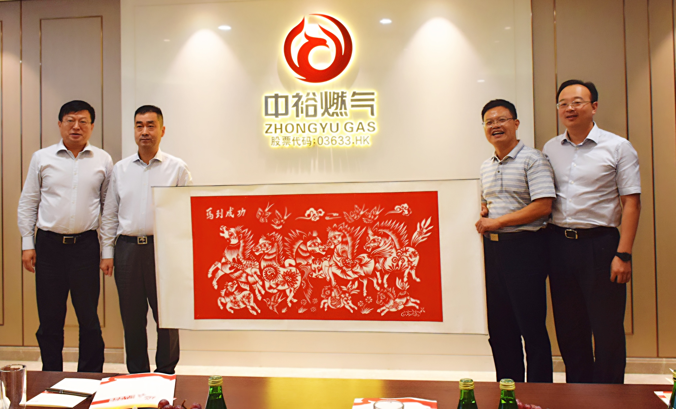 會談結(jié)束時,楊市長一行特地向中裕燃?xì)馑蜕弦环}為《馬到成功》的陜西特產(chǎn)“剪紙畫”,寓意延安市政府與中裕燃?xì)獾暮献饕矊ⅠR到成功。雙方領(lǐng)導(dǎo)本次會面為中裕燃?xì)忾_疆拓土、發(fā)展新業(yè)務(wù)提供了良好契機。